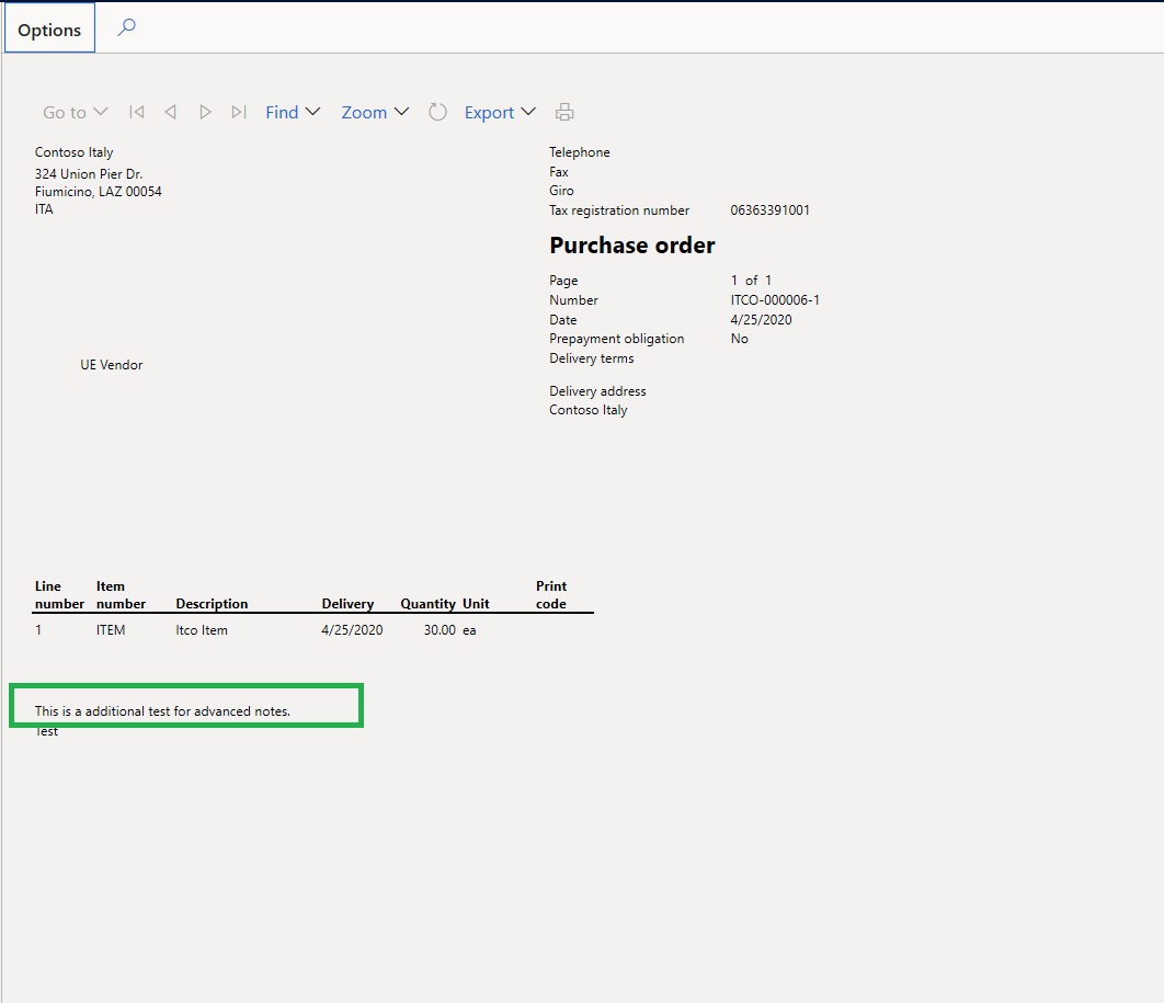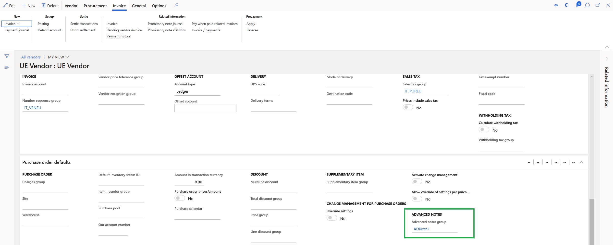 A new feature has been recently added in Dynamics 365 F&O is the ability to add such static notes to external facing business documents – such as Purchase order, Free Text Invoice, Sales Quotation, Sales invoice etc., using combination of Vendors, Customers, Groups, Item etc. This is named as “Advanced notes” management. There are couple of simple configurations that would have to be done and I’m going to walk them through here.I’m using an example of Purchase order here, and this can be used on the AR/Sales and Marketing side of external documents.