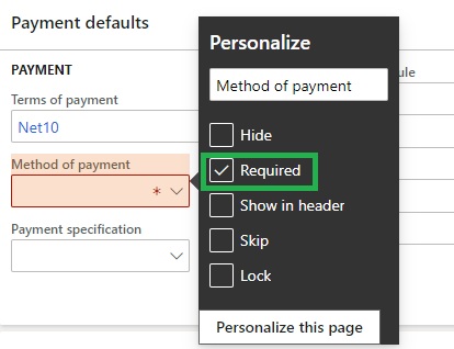 Right click on “Method of payment” and choose “Required”. You can see immediately the typical/trademark Dynamics 365 Fin Ops mandatory signal visible and follows the usual validations as provided by OOTB column/fields when trying to save without of filling it.