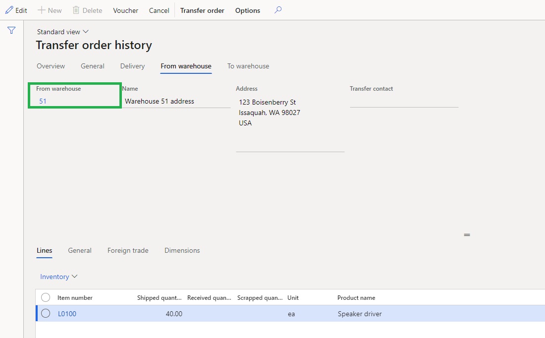 Before we proceed further with the working let us review the status of the Inventory transactions that are associated with this Transfer order. This transfer order is being shipped from Warehouse 51 as you can see below: