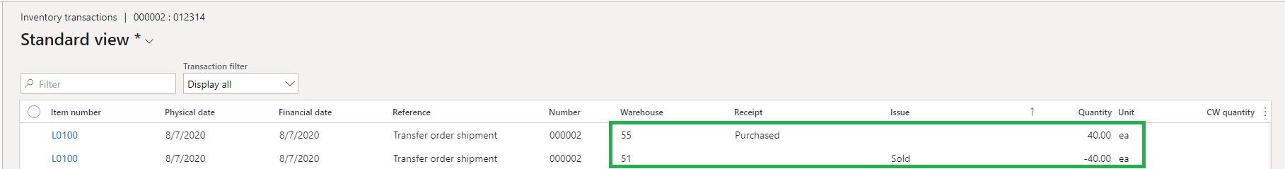 The inventory transactions for the item that is on this transfer order is as below: