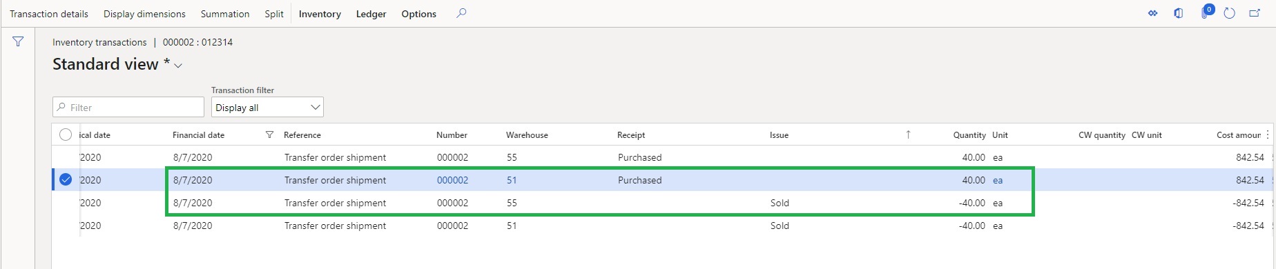 When the transfer order that is in Shipment status is canceled, you can see the transactions highlighted below. Notice the way the system creates a proper transaction to be able to reverse the transactions from above screenshot that were create when the transfer order was shipped.