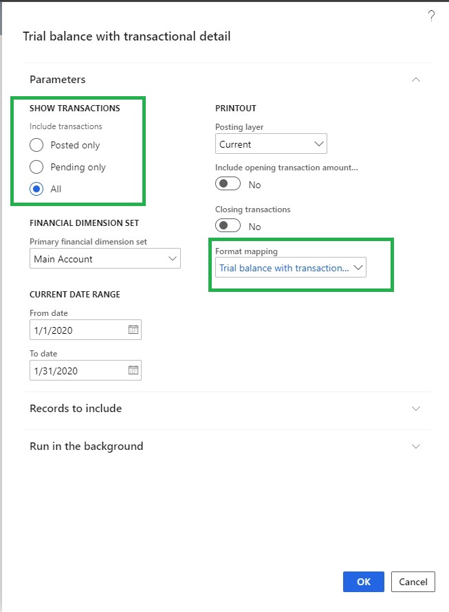 Trial Balance with detailed transactions report in Dynamics 365 Finance