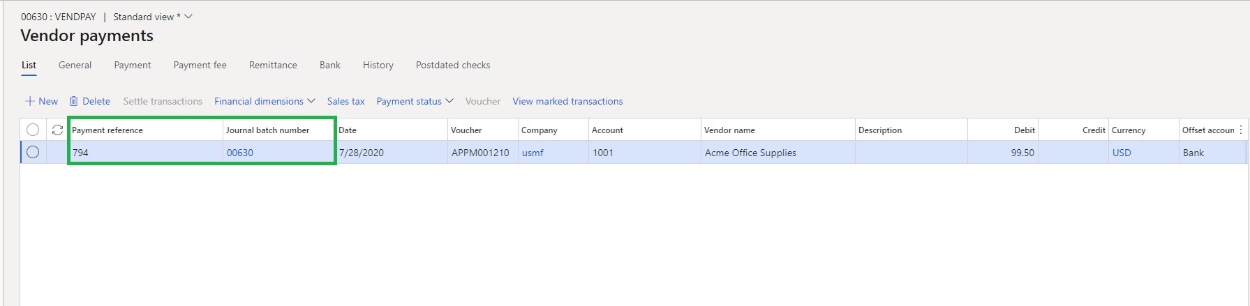 When the report is executed for the month of July (1st of July to 31st of July), you can see the transactions being generated appropriately based on the parameter that is chosen to see All transactions that includes both Pending and Posted transactions. Note that, since this is using Electronic reporting configuration with an excel format, the report that is generated would be downloaded as an excel, instead of generating the report as it usually opens for an SSRS  based report. Pending transactions are denoted with ** as highlighted below and the document in this case shows the Journal batch number and since this is a payment journal, it shows the Payment reference as well.