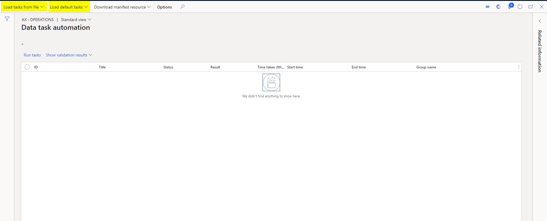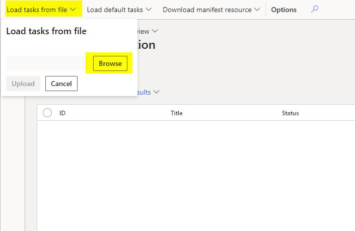 - Load tasks from file: This option allows you to load the manifest file from a local drive. This means that the Solution Architect or the Functional lead should be owning this process. Remember the key reason or idea of having the data or configuration migration being automated is to have a better control and allowing multiple people to maintain different manifests would result in chaos. Of course, if there are teams that are split according to workstreams (Supply Chain, Finance, O2C, P2P etc.,) then it would make sense to allow each teams to maintain their own manifests, but even in that case the recommended approach would be to have one contact person handling this.