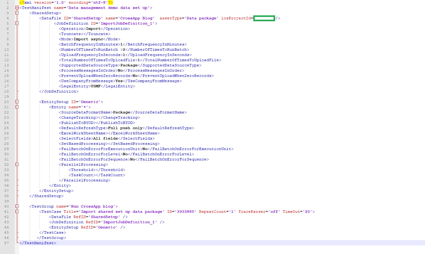 Now that we understand what and how data task automation can be utilized and what are various ways to manage a manifest, let us review what a manifest looks like and use it in a sample test to load using an LCS project. In my case, I’m going to load the resource/manifest from my local machine.