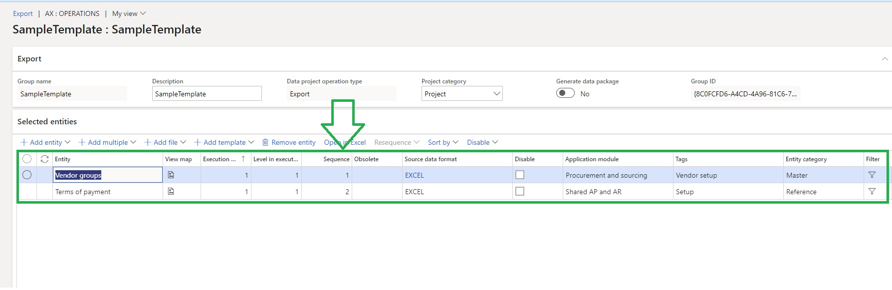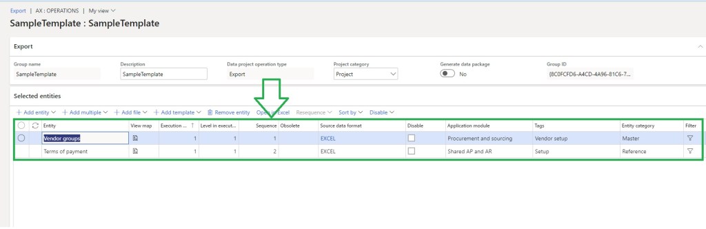 When you choose the option, you can see that the data entities that are added in the template, in the sequence that is presented there, show up here.