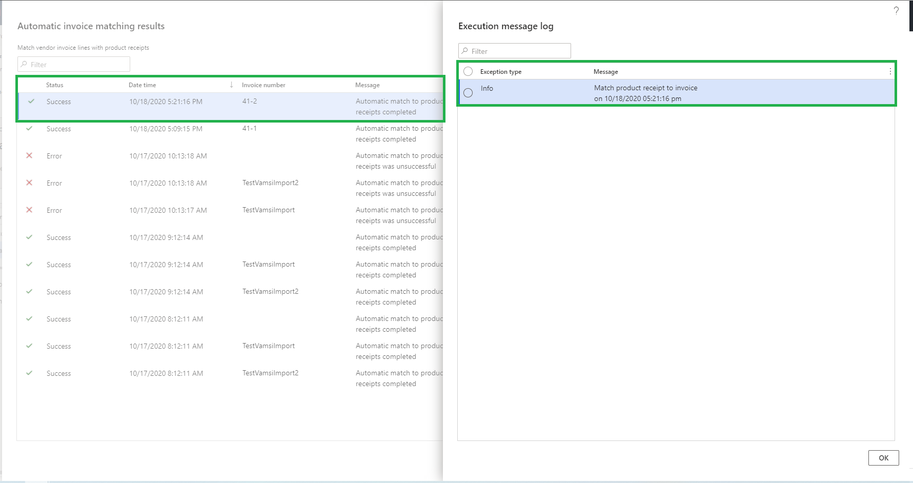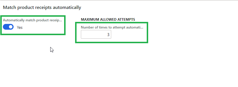 2. Automatically match product receipts to invoice lines and Number of times to attempt matching under Accounts Payable parameters -> Vendor invoice automation: These are 2 new parameters that are added. The automatically match product receipts to invoice lines performs the matching of the receipts to the invoice lines that are pending and the number of times to attempt automatic matching performs the matching only that many times an invoice is attempted to match with product receipts. After that, it would exit from the matching logic and log the messages in the dashboard.