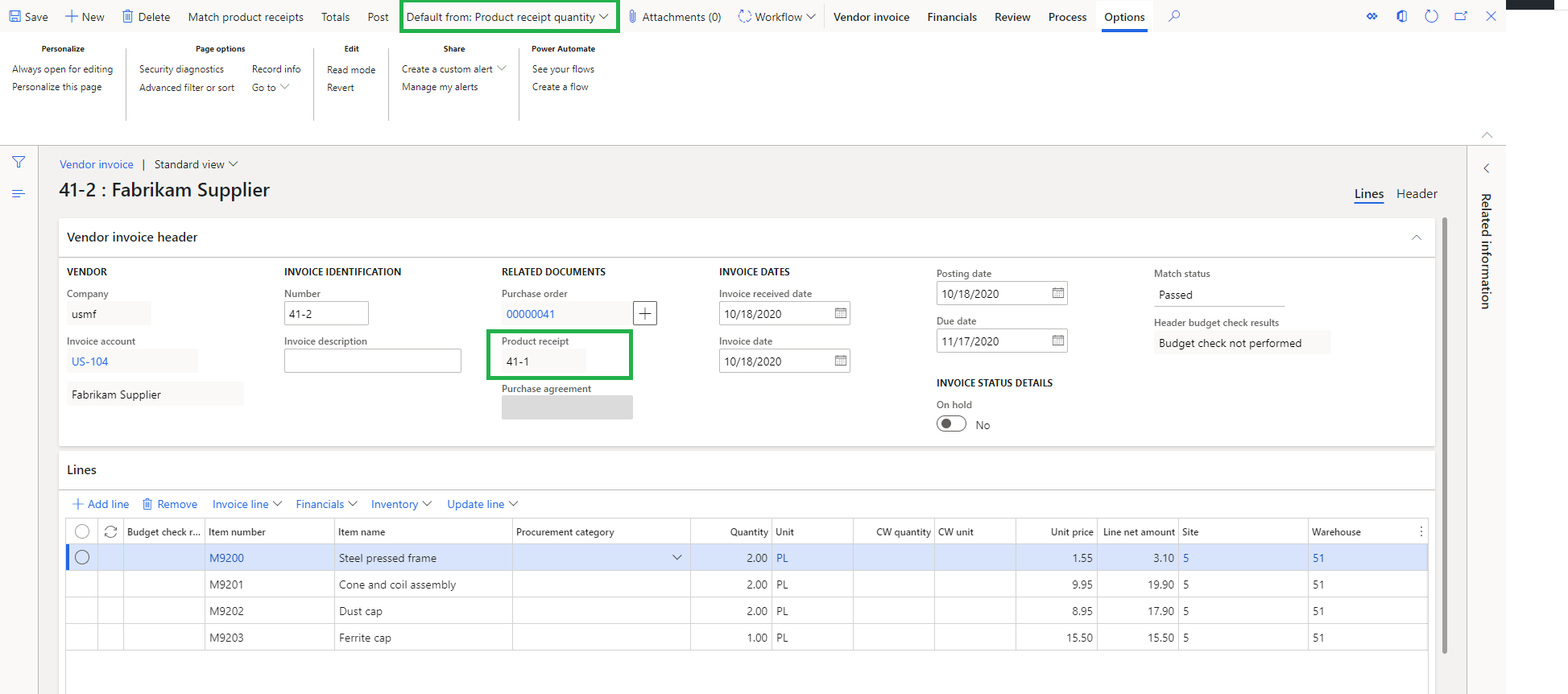 And you can see that the invoice has been automatically matched with the product receipt and you can see that the quantity has been updated to Product receipt quantity.