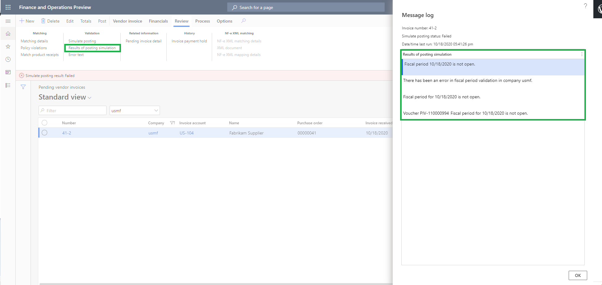 A new button Simulate posting is added on the list page of Vendor invoices under the review tab. Note that, this option is available only in the list page view and not in the detailed view. The idea is to have the AP Processor simulate posting for multiple invoices simultaneously and save some time.