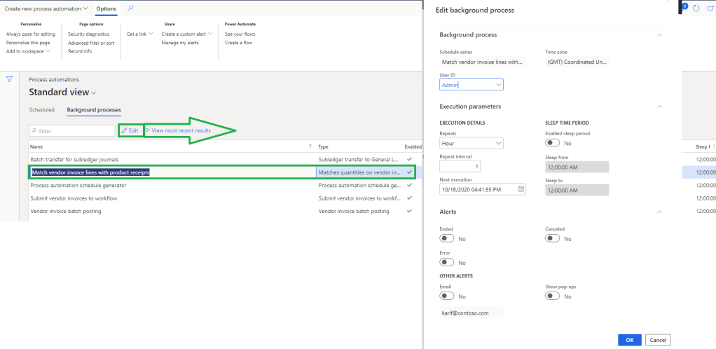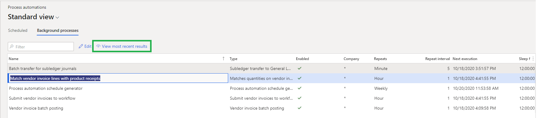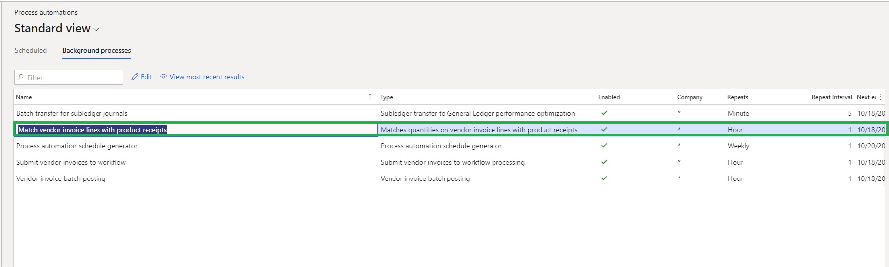 For this particular process, there is a background process that is already created/initialized in my environment and the one highlighted is the process that matches the Product receipts to Invoice lines. This is available under System administration -> Setup -> Process automations.