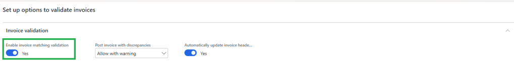 1. Enable Invoice matching validation under Accounts Payable Parameters -> Invoice validation: This is an existing parameter, which enables the matching policies , like 3 way match, Total matching etc., that you may choose for your organization.